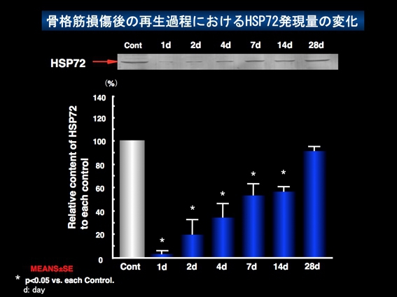 筋肥大のメカニズムの一つとして、熱ショック蛋白質72(Heat Shock Protein;HSP72)が関与すると言われています。トレーニングは、筋蛋白質の合成量を増加させることで筋の肥大をもたらしますが、同時に熱ストレスや機械的過負荷、過酸化といったストレスも増加させます。これに対して筋はHSP72を増加させることが報告されています。我々はブピパカインという薬剤をラットの筋肉に注射して実験的に筋損傷を起こさせ、その再生過程を追いかけました。その結果、筋線維の再生より早い段階でHSP72の発現量の回復が見られ,その後筋線維の再生と類似した変化を示すことが分かりました。
