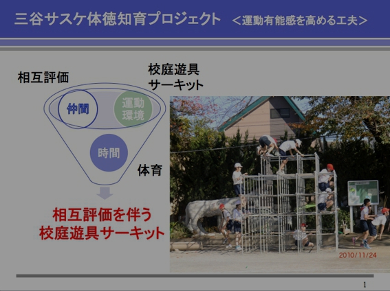 大森研では平成19年度から東京都杉並区三谷小学校との連携により、「三谷サスケ体徳知育プロジェクト」を続けてきました。走・投・跳の運動指導や相互評価を伴う校庭遊具サーキットの導入などを行い、その効果を体力学的、心理学的、生化学的に判定しています。肯定的な相互評価を伴う校庭遊具サーキットは、子どもの運動有能感を高め、唾液クロモグラニンA(交感神経系ストレス指標の一つ)を下げました。これらの心理学的・生化学的効果が子どもの日常運動量にどのように影響し、体力にどのように影響するのか?また認知機能の発達にどのように関わるのか?さらに、長期的な効果はどのようになるのか?研究は進展を見せています。