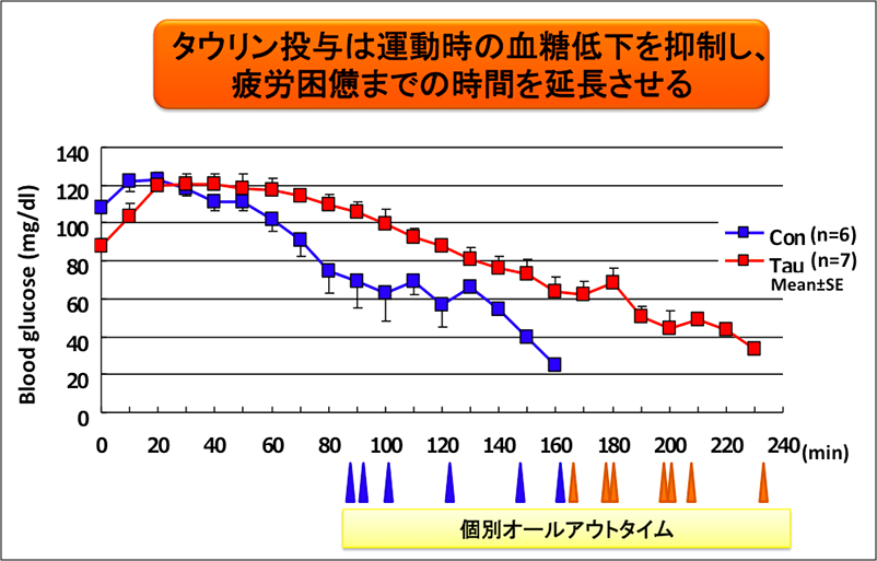 大森研では、「長時間運動に伴う血糖(脳のエネルギー源)の低下がタウリンを摂取することで抑制される」という研究を行っています。我々は、タウリンによる血糖低下の抑制が運動時間の延長をもたらすという動物実験モデルを確立しました。この現象のメカニズムとして、肝臓でのグリコーゲン分解や糖新生が関わっていると考えています。同時に、運動時の骨格筋や脳への糖取り込み・利用について究明したり、脂肪組織を含む各臓器にわたる糖質・脂質・蛋白質の代謝を統合的に理解していくことが、これからの興味深い課題です。