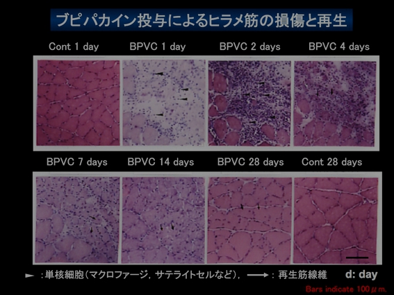 筋肥大のメカニズムの一つとして、熱ショック蛋白質72(Heat Shock Protein;HSP72)が関与すると言われています。トレーニングは、筋蛋白質の合成量を増加させることで筋の肥大をもたらしますが、同時に熱ストレスや機械的過負荷、過酸化といったストレスも増加させます。これに対して筋はHSP72を増加させることが報告されています。我々はブピパカインという薬剤をラットの筋肉に注射して実験的に筋損傷を起こさせ、その再生過程を追いかけました。その結果、筋線維の再生より早い段階でHSP72の発現量の回復が見られ,その後筋線維の再生と類似した変化を示すことが分かりました。