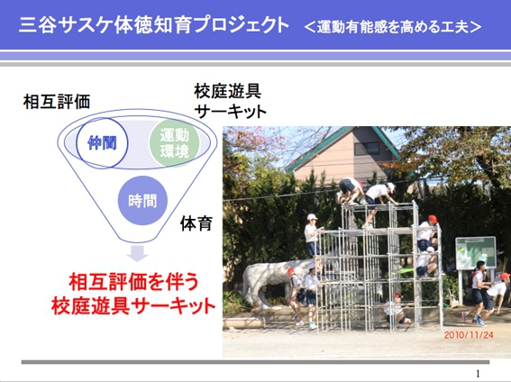 大森研では平成19年度から東京都杉並区三谷小学校との連携により、「三谷サスケ体徳知育プロジェクト」を続けてきました。走・投・跳の運動指導や相互評価を伴う校庭遊具サーキットの導入などを行い、その効果を体力学的、心理学的、生化学的に判定しています。肯定的な相互評価を伴う校庭遊具サーキットは、子どもの運動有能感を高め、唾液クロモグラニンA(交感神経系ストレス指標の一つ)を下げました。これらの心理学的・生化学的効果が子どもの日常運動量にどのように影響し、体力にどのように影響するのか?また認知機能の発達にどのように関わるのか?さらに、長期的な効果はどのようになるのか?研究は進展を見せています。